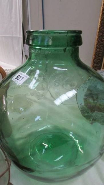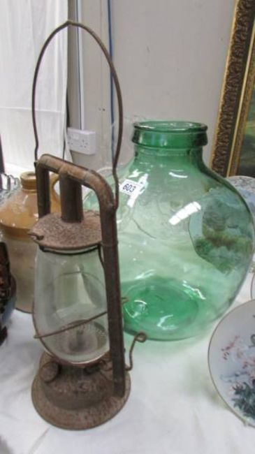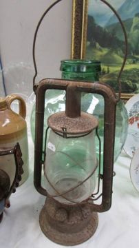 A glass carbide and a hurricane lamp.