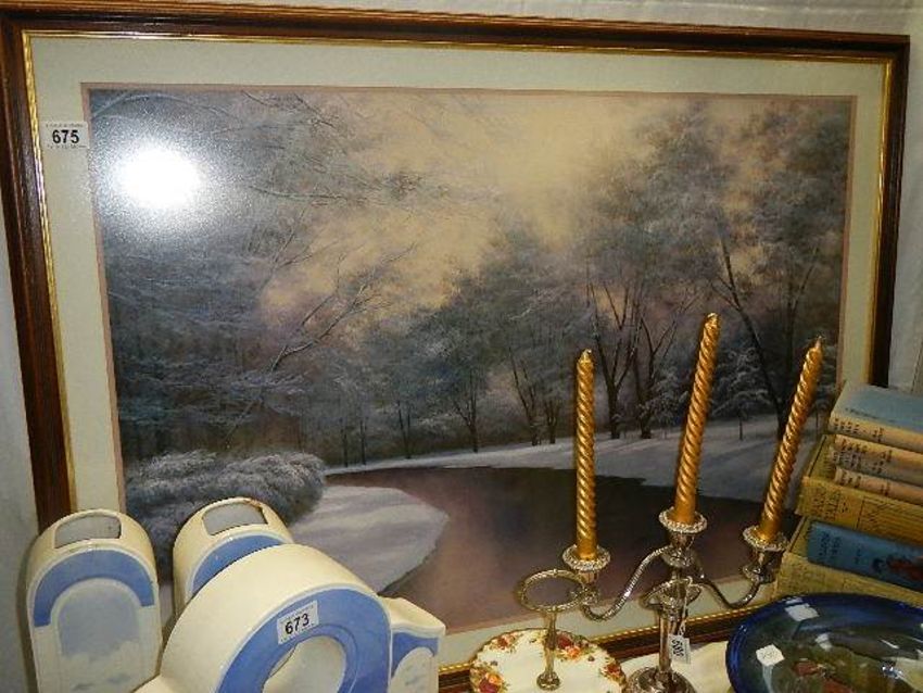 A large framed and glazed winter scene.