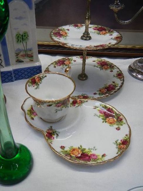 A Royal Albert Old Country Roses cake stand and tea cup with sandwich plate.