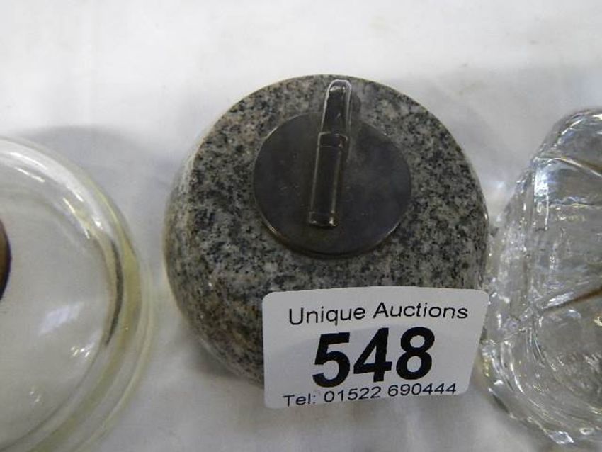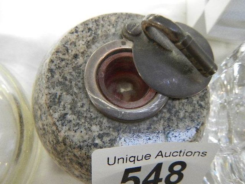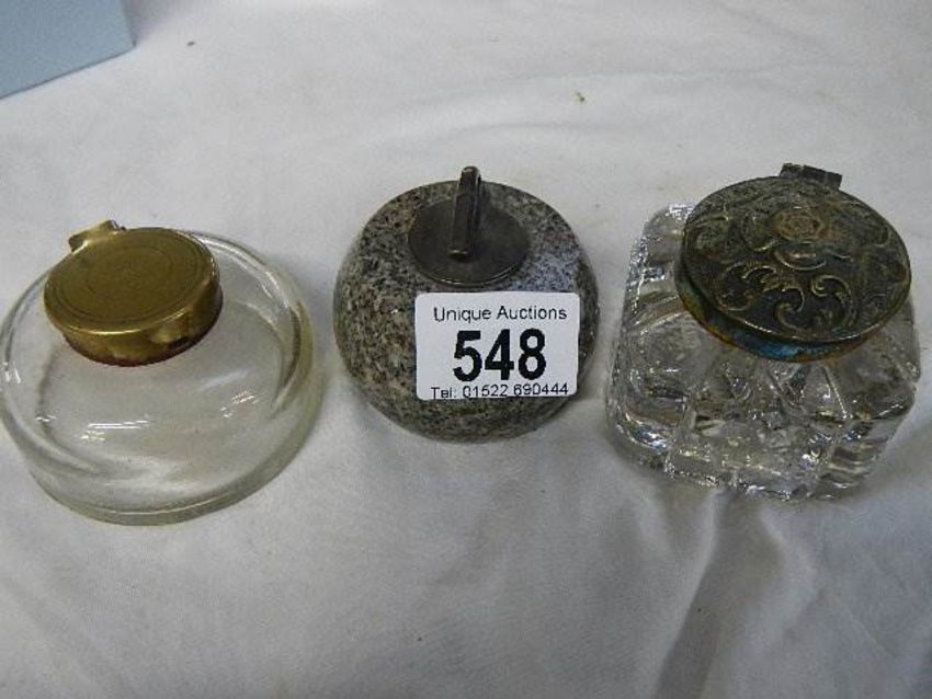 Two glass inkwells and an inkwell in the form of a curling stone.