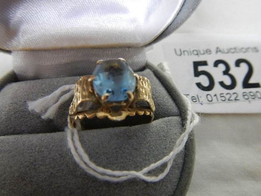 A 9ct gold ring set pale blue stone, size N, 3.1 grams (scratches to stone).