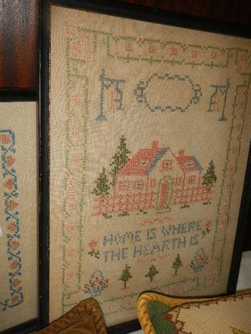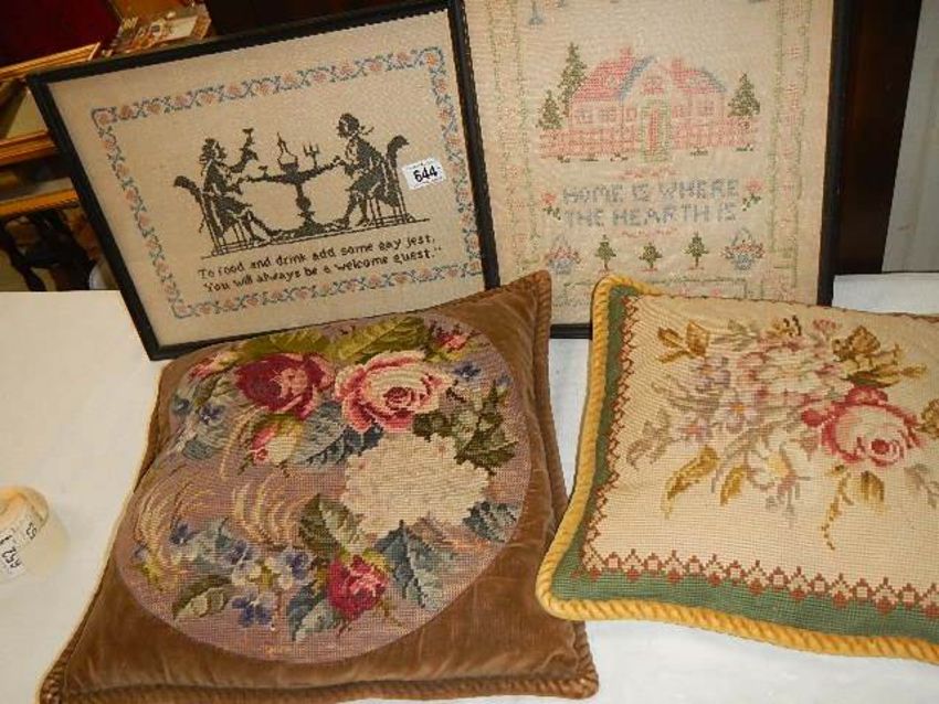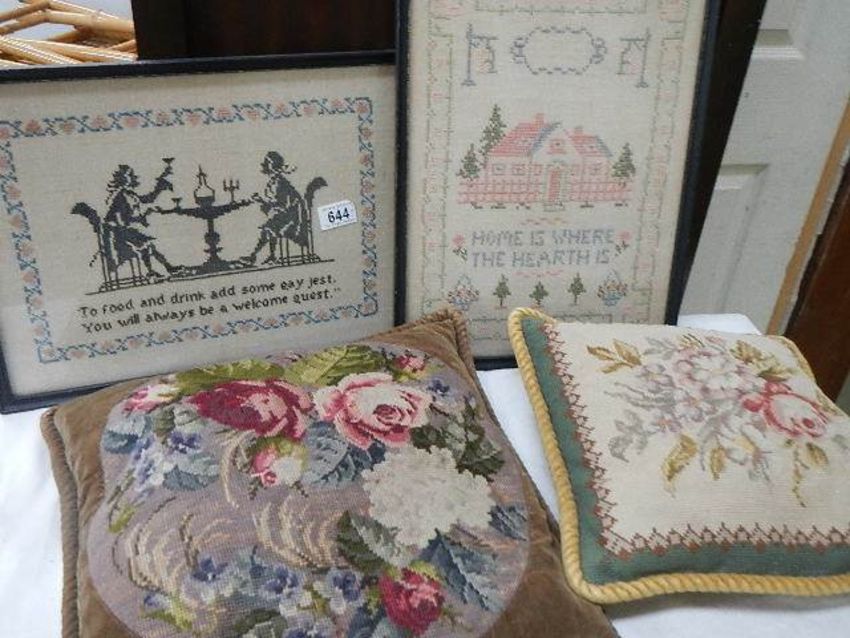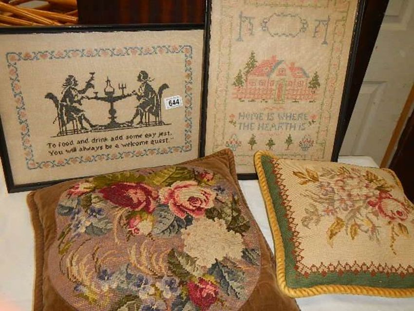 Two old samplers and two embroidered cushions.