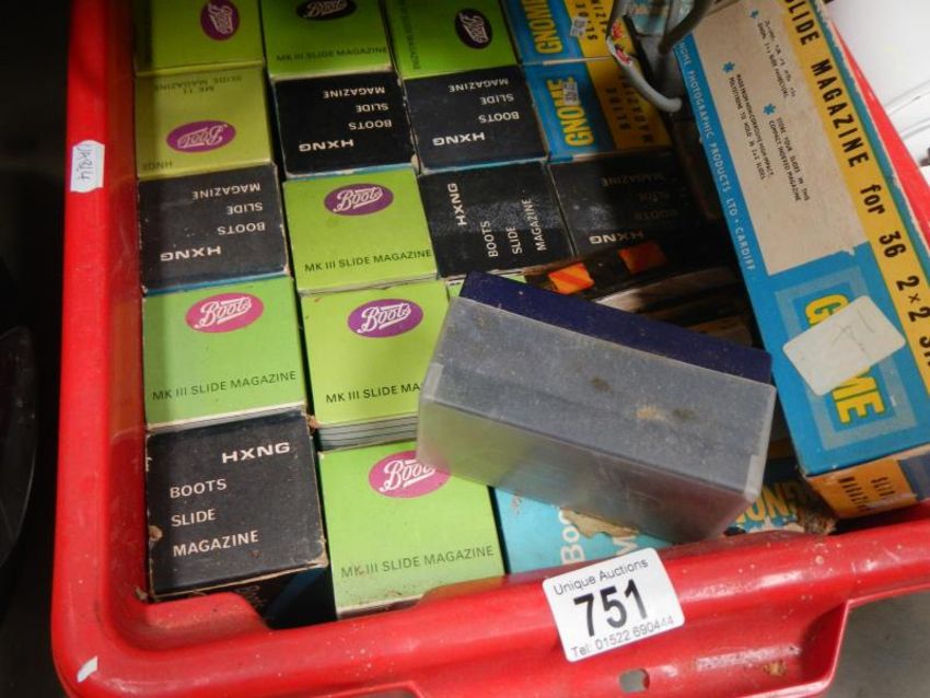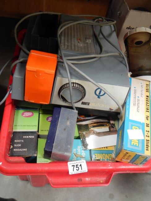 A box full of slides in boxes & a boots automatic projector