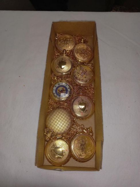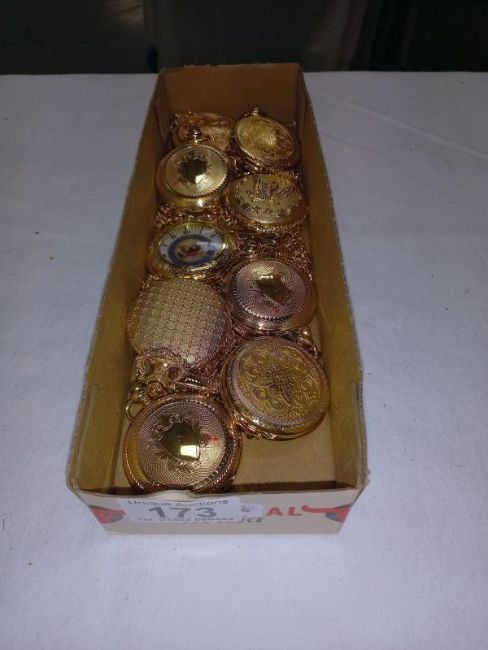 9 gold coloured pocket watches. Some in working order
