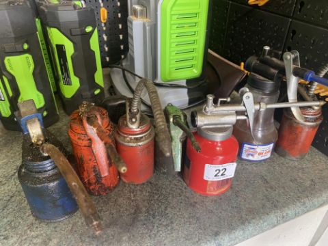 A collection of 7 antique and modern oil cans.