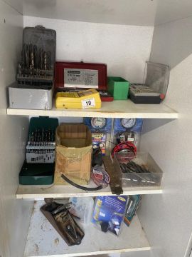 A large lot of drill bits, small socket set, compression tester, vacuum tester etc.