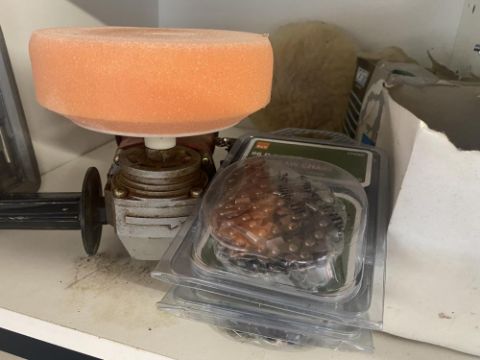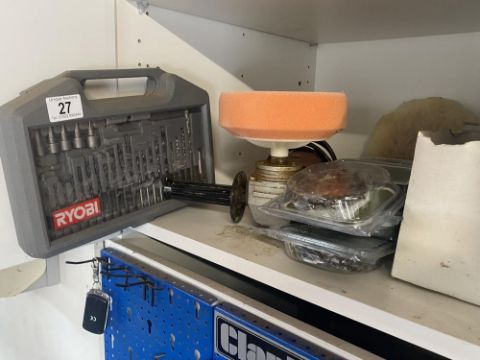 A shelf of chainsaw blades, 240V polisher and drill set.