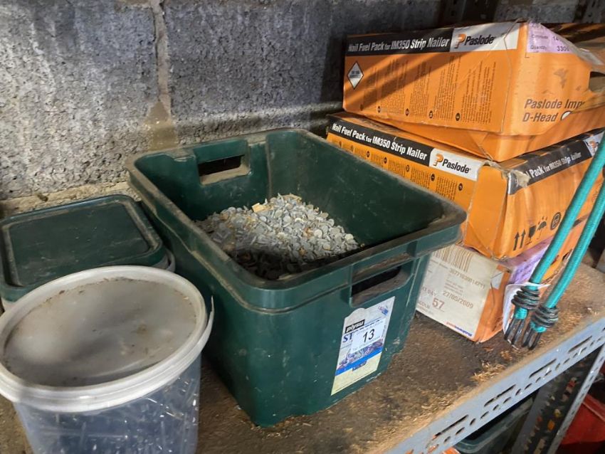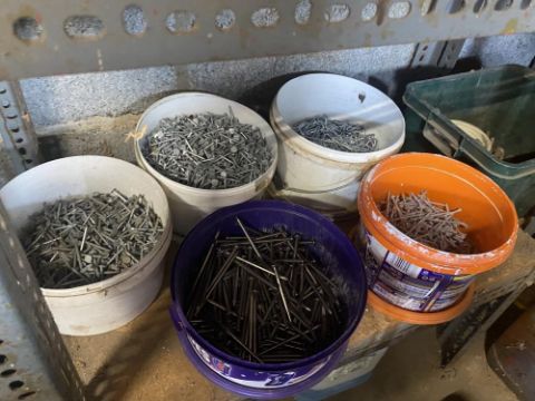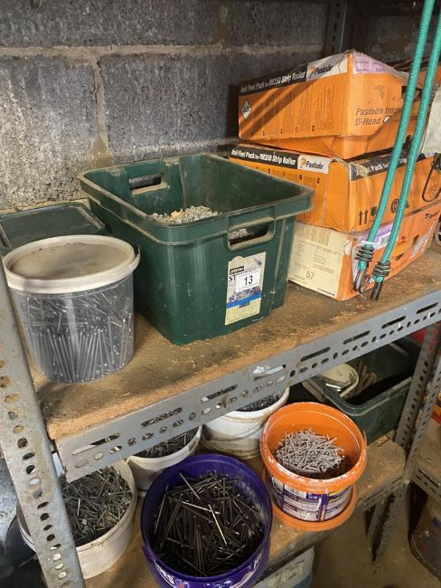 A shelf of paslode nails, felt nails, lost head nails 2" and clout nails.