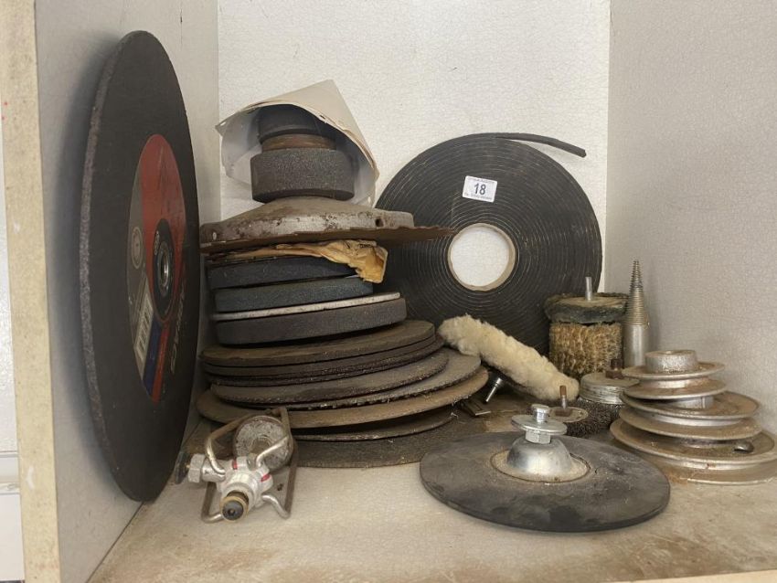 A mixed lot of cutting and grinding discs and saw blades, pulleys and arbours.