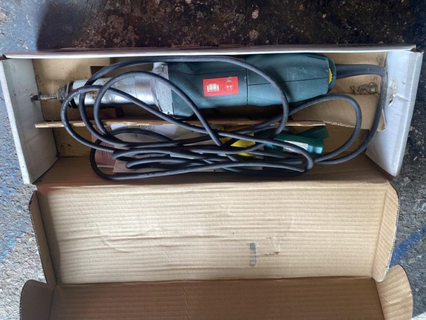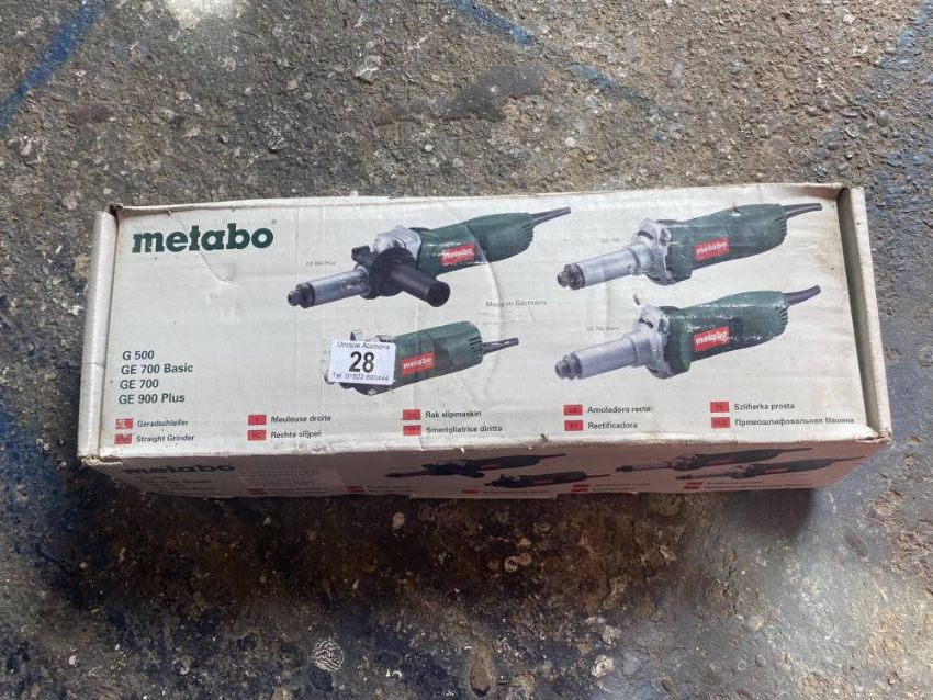 A Metabo straight 110V grinder pop riveter and tyre pressure pump.
