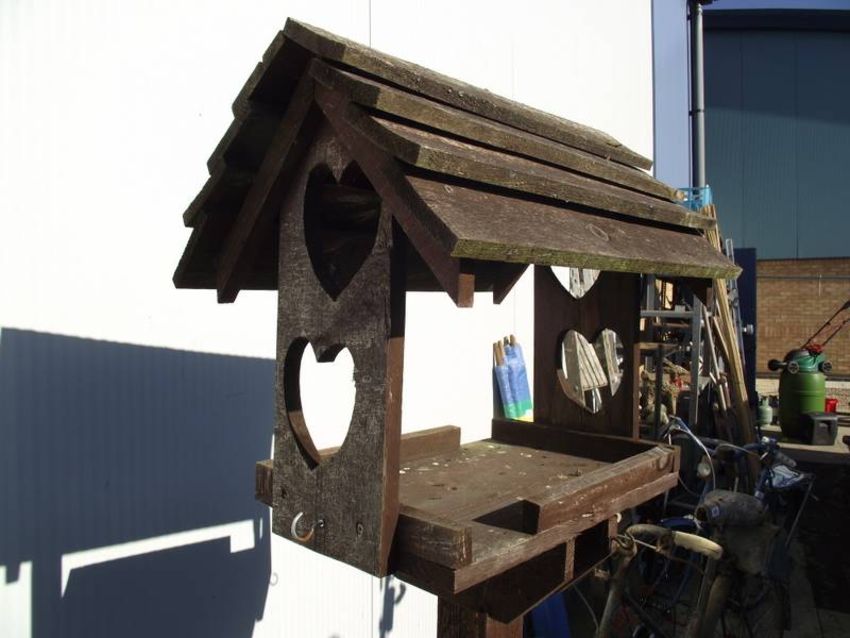 A wooden bird table with heart cut aways. COLLECT ONLY.