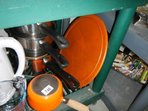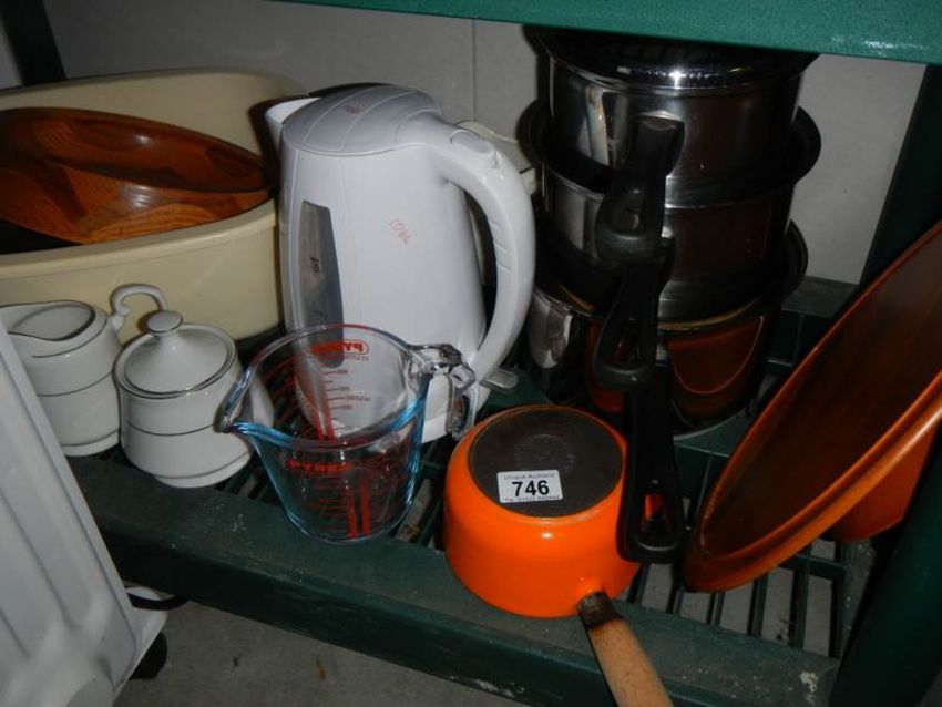 A Le Crueset milk pan and other kitchen items.