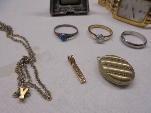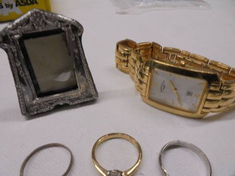 A mixed lot including small hm silver photo frame, silver rickshaw, gold pendant, 3 dress rings, locket, gent's Rotary wrist watch etc.,