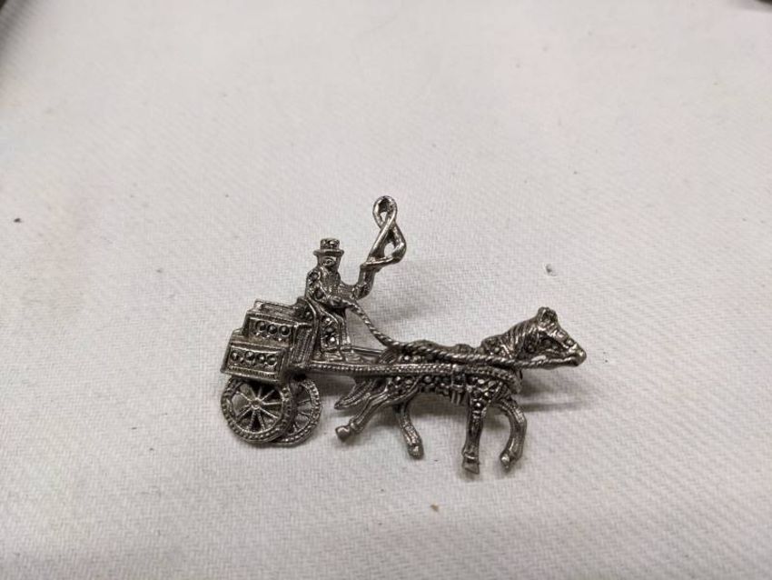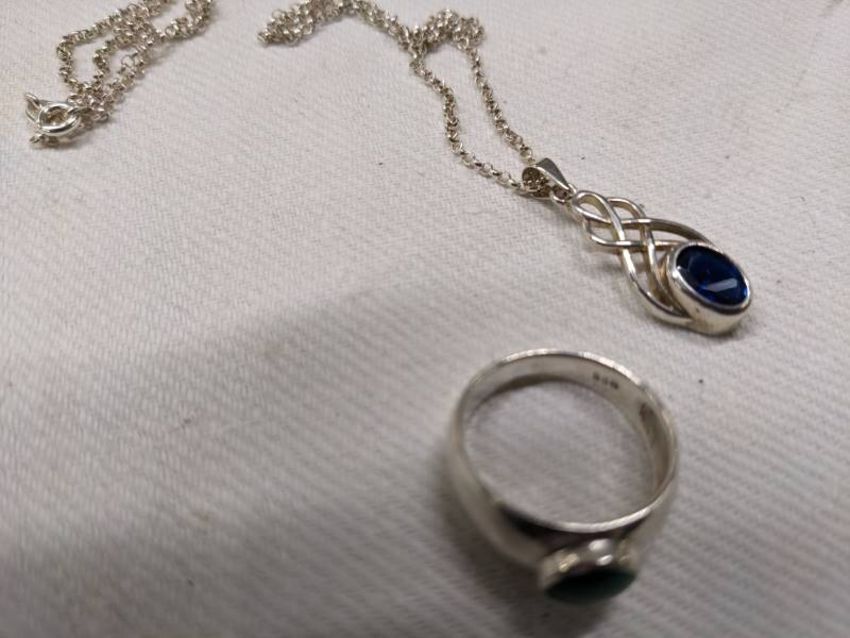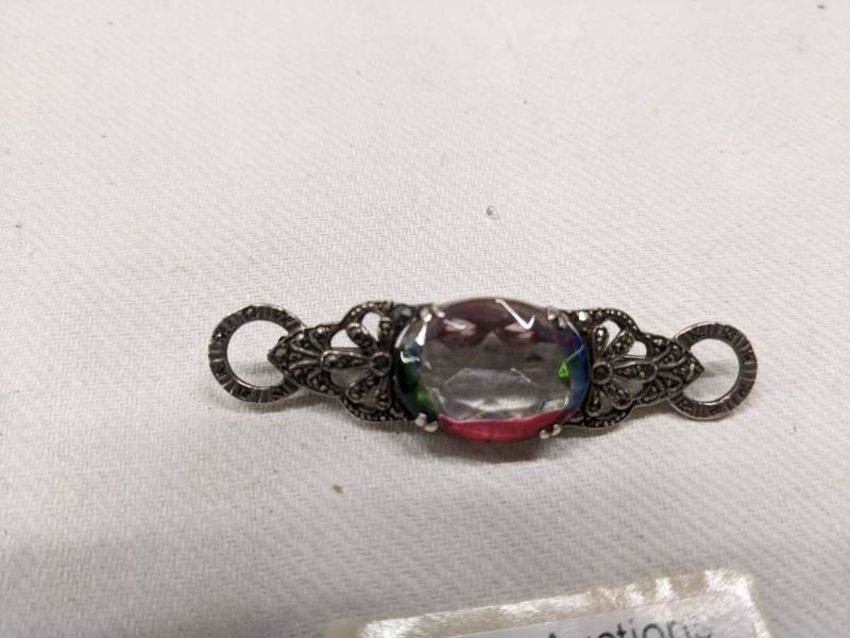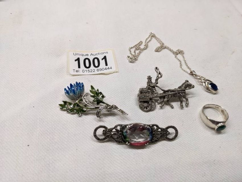 A silver pendant, silver ring and three marcasite brooches.