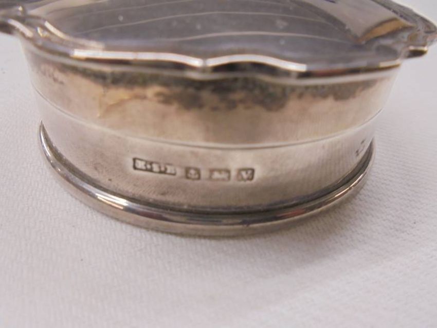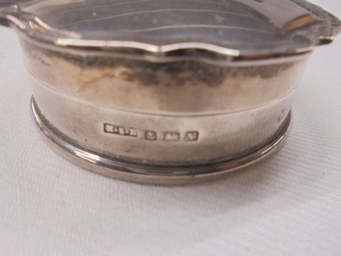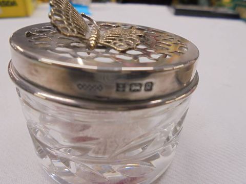 A hall marked silver trinket box with coat of arms 'S.s.Ormuz' 38 grams and a glass silver topped trinket pot.