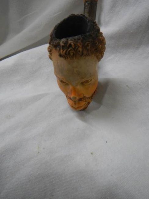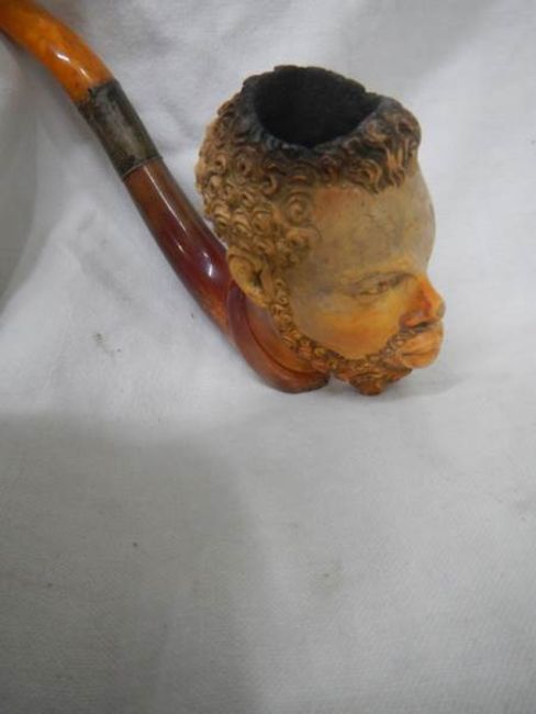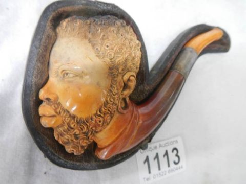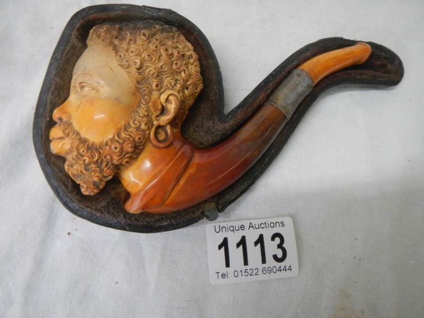An old cased Meerscham pipe of a man's head.