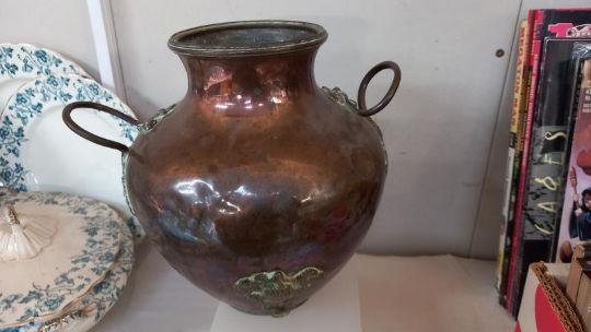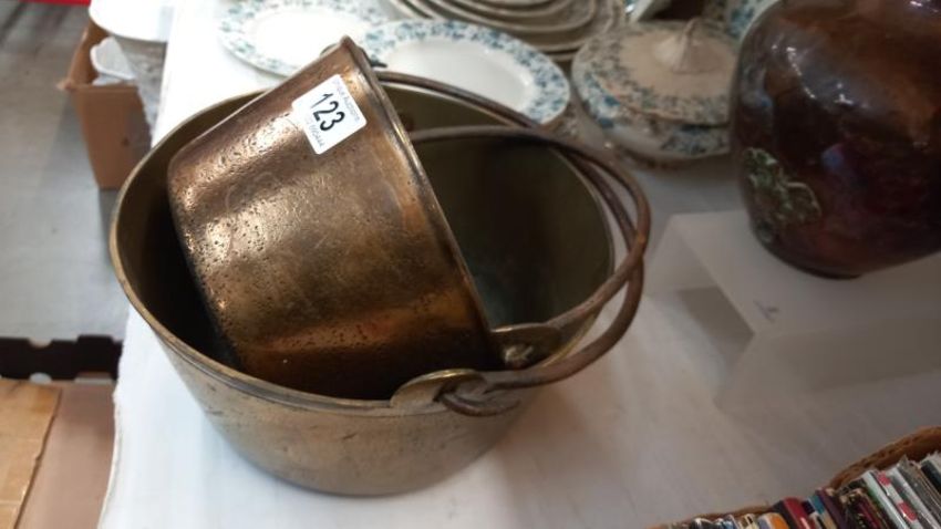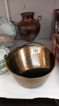 2 Victorian brass jam pans & a copper vase. COLLECT ONLY