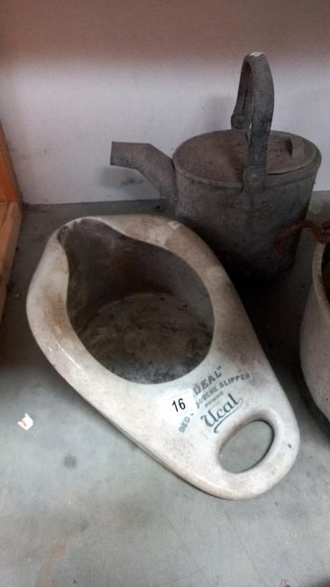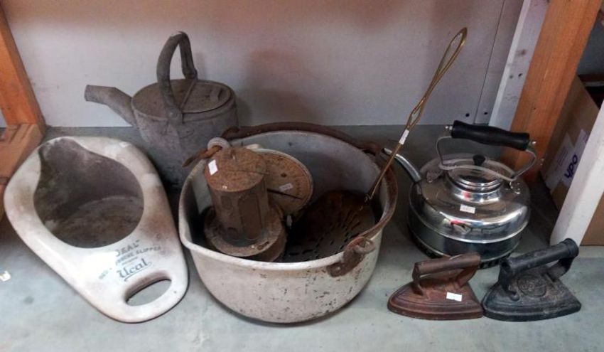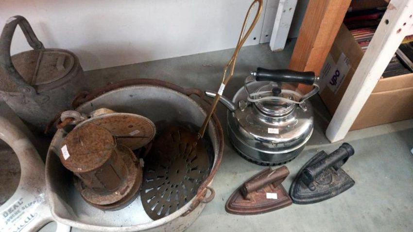 A vintage small galvanised watering can, jam pan, cast iron flat irons & balance scales etc.