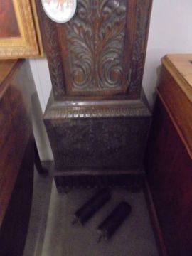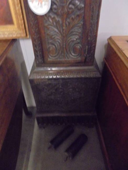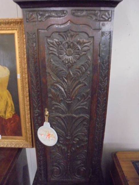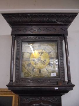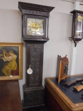 An early carved oak Grandfather clock, 8 day with brass dial, COLLECT ONLY.
