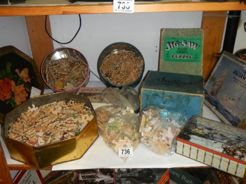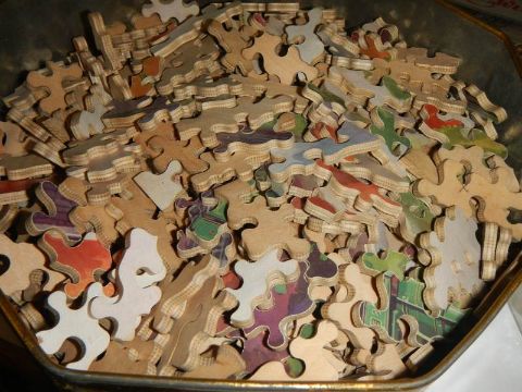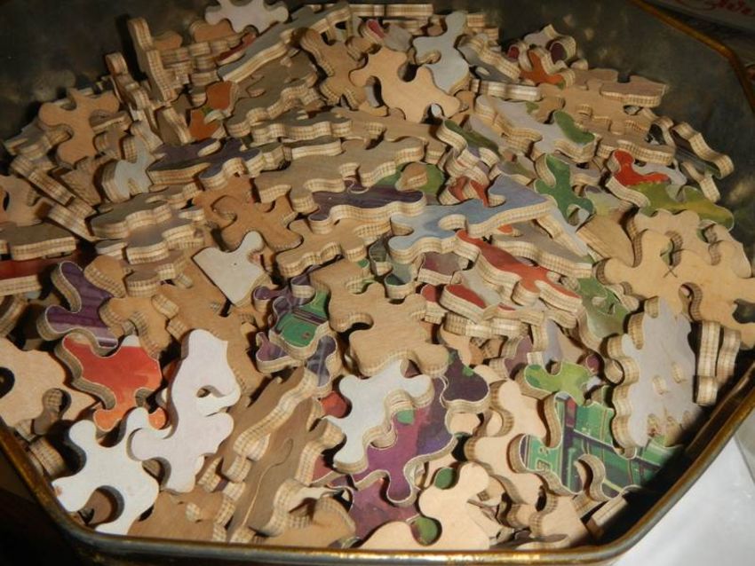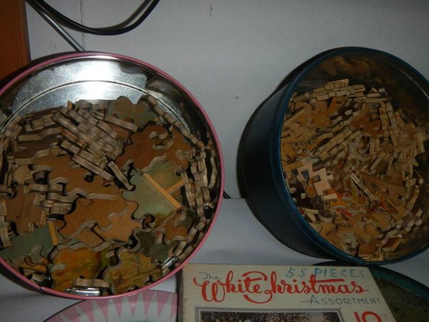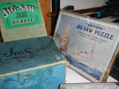 A shelf of old wooden jigsaw puzzles, completeness unknown