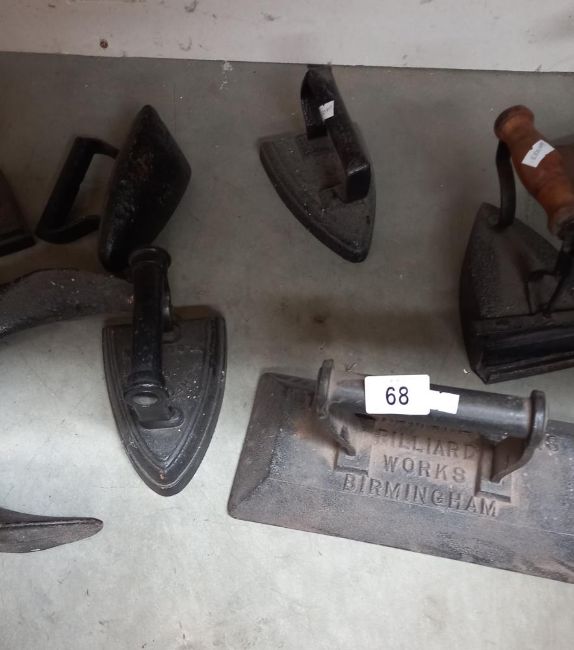 A Thomas Padmore and sons billiard table iron and selection of cast iron boot lasts, flat irons and weights COLLECT ONLY