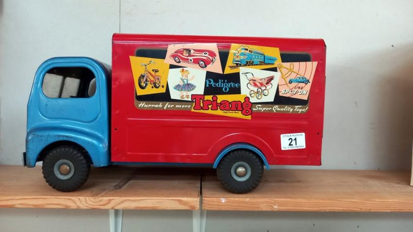 A large 1950/60's Tri-ang pressed steel van with toy adverts on sides
