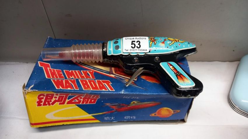 A boxed tinplate The Milky Way boat MF215, made in China and a vintage space gun