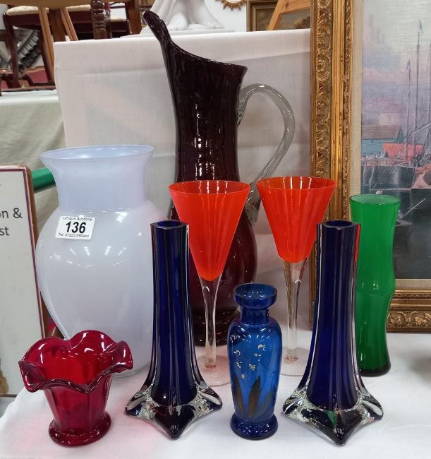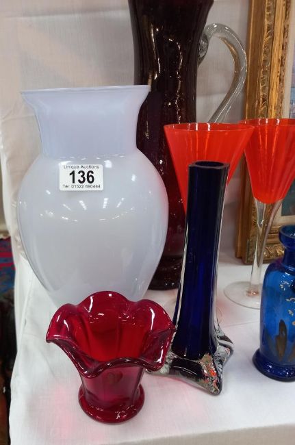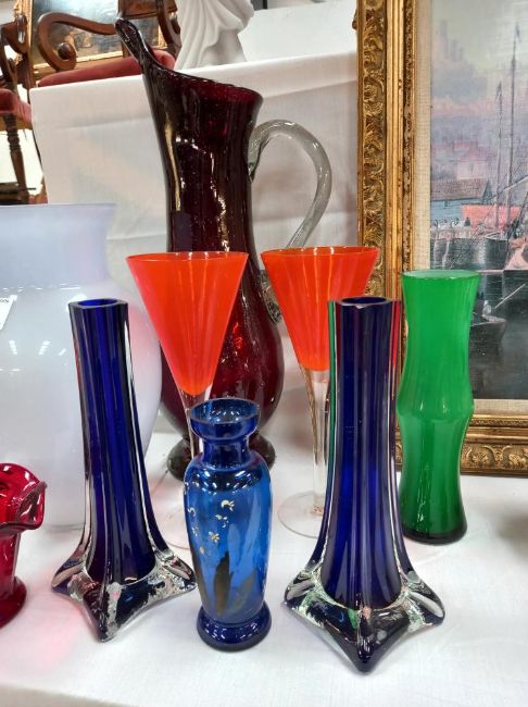 A selection of coloured glass including a pair of spill vases etcThe pair of  blue spill vases have a small chip on the rimThe small blue vase is chipped on the rimThe other pieces are in good condition
