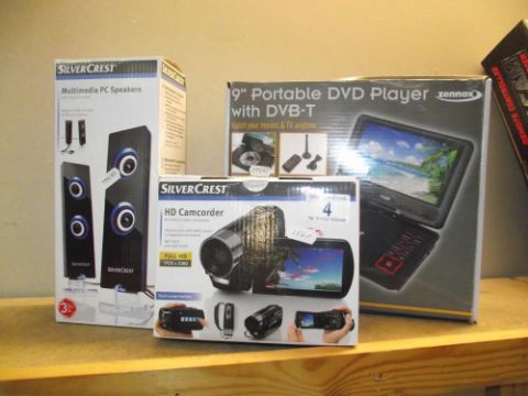 A 9" portable dvd player by Zennox, Silvercrest HD camcorder and multimedia speakers, all boxed