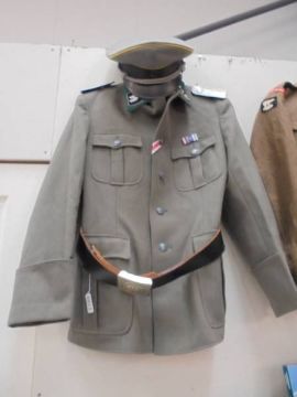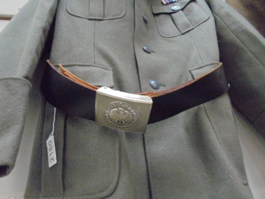 An East German officer uniform comprising trousers/jodphurs waist 34, custom tunic (large or medium) West German hat size 60 and West German belt.