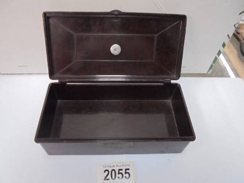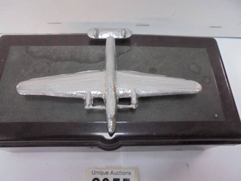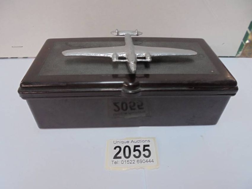 A vintage bakelite cigarette box with surmounted white metal aeroplane, 17 x 8.5 x 6 cm,