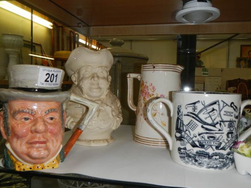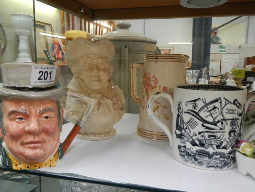 Two Toby jugs, another jug and a two handled tankard.