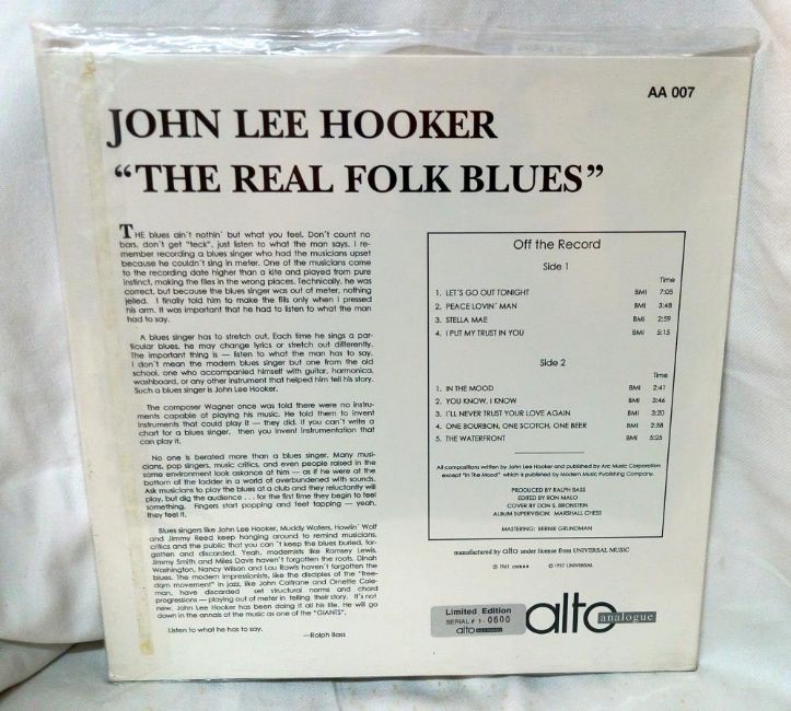 John Lee Hooker, The Real Folk Blues, Alto Analogue Label, AA004, 1997, Nr Mint, Re Issue, Remastered, Ltd Edition No. 0600