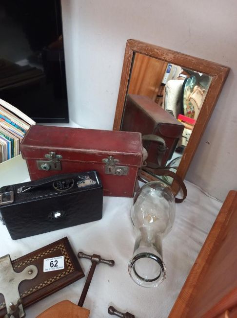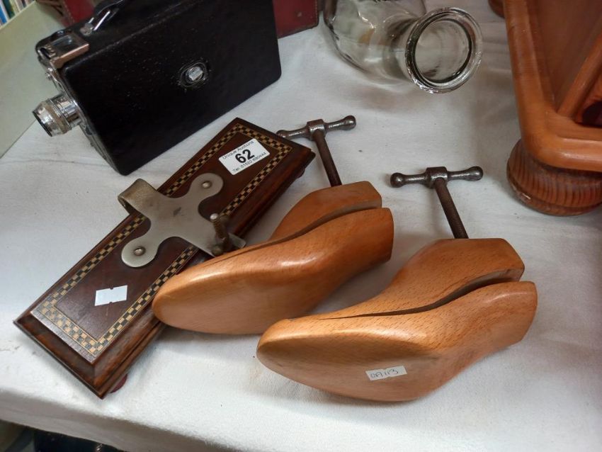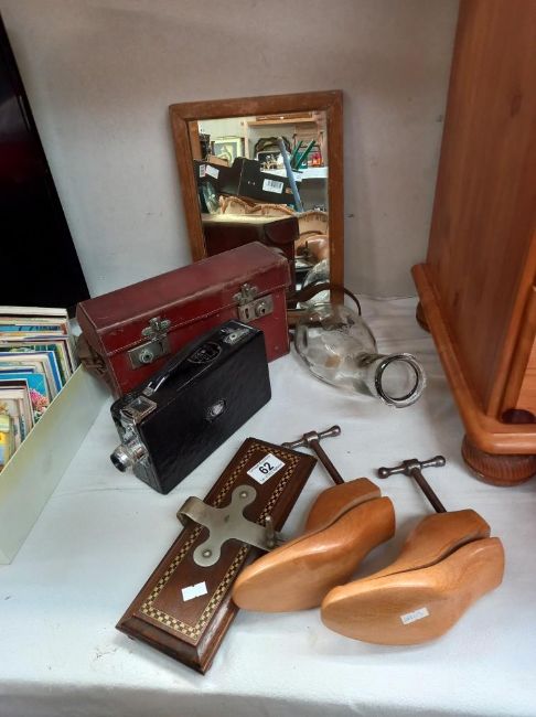 A cased cine Kodak model K, a cine camera, old tie press, shoe stretchers & wine carafe etc. COLLECT ONLY