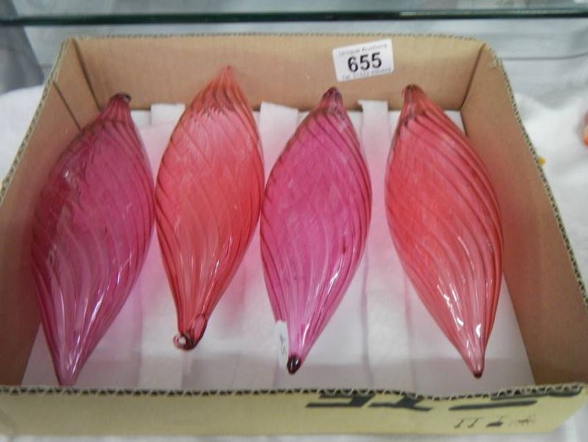 Six cranberry glass Christmas tree baubles.