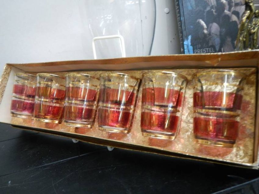 A boxed set of vintage gilded shot glass and a carafe/decanter, COLLECT ONLY.