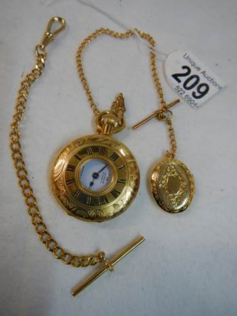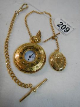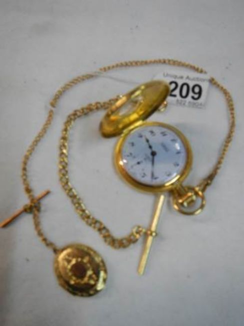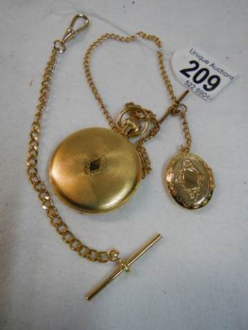 A gold coloured half hunter pocket watch with chain.