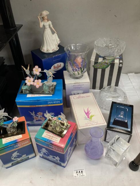 A quantity of boxed items including handmade glass humming birds, Caithness vase etc