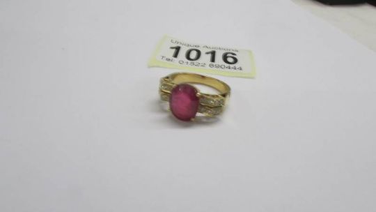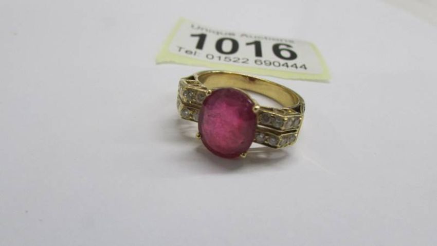 An 18ct white/yellow gold oval ruby and diamond ring, size O half, 6.2 grams.