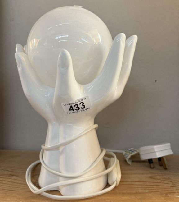 A white glazed pottery pair of hands holding spherical glass shade table lamp. In working orderNo visible damage, height 28cm