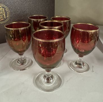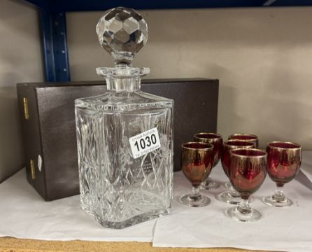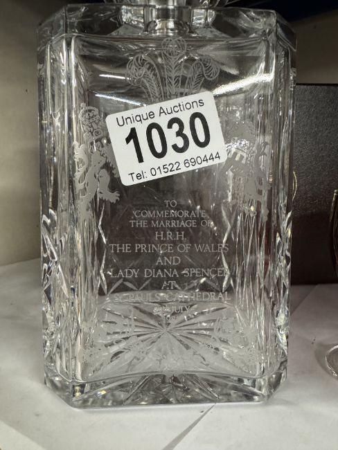 A boxed hand cut lead crystal decanter commemorating the marriage of The Prince Of Wales & Lady Diana Spencer & 6 cranberry glasses