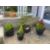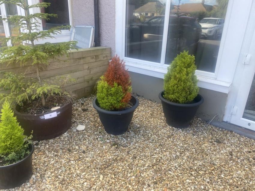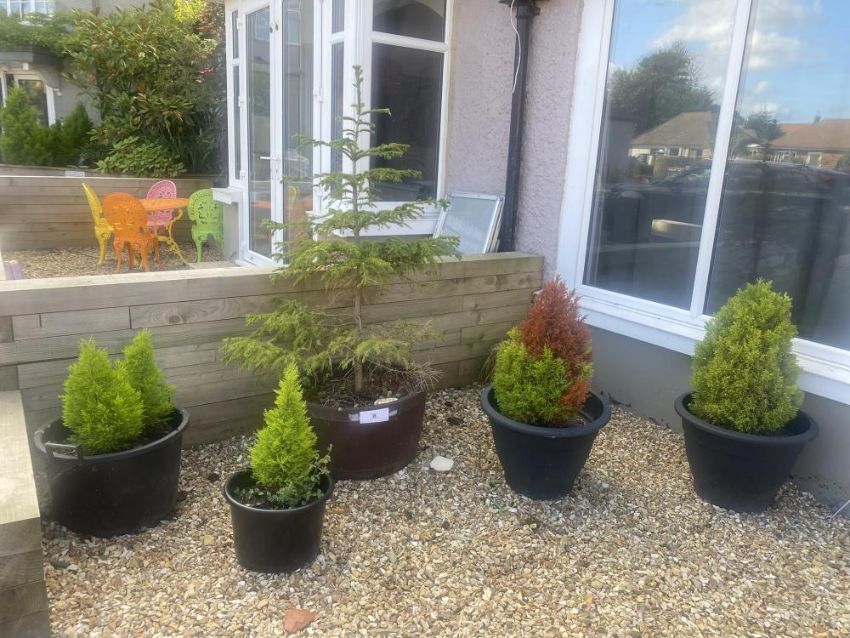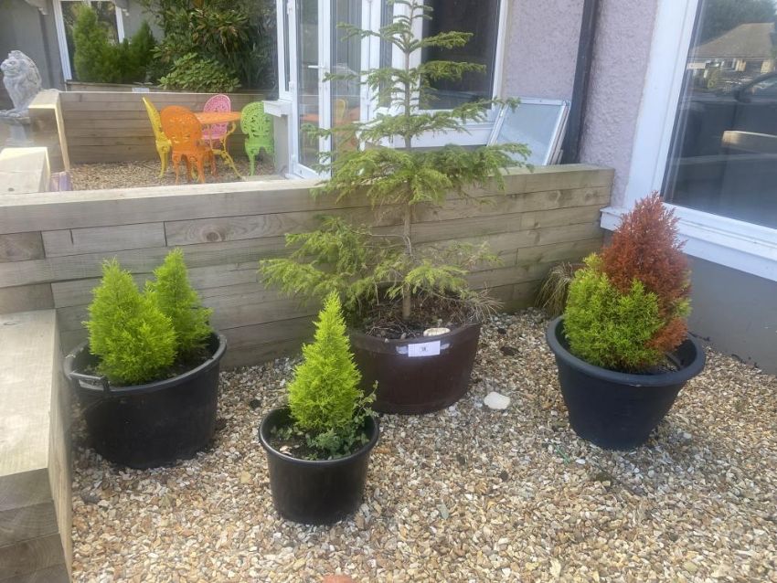 Four potted conifers and a potted fir tree.
