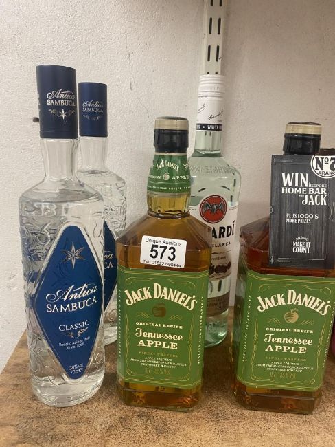 5 bottles of alcohol, including Jack Daniel's Tennessee Apple, Sambuca and Bacardi.