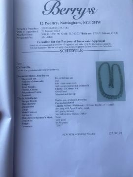 A Platinum and Diamond Necklace (approximately 20.81 carats of diamonds) with an insurance certificate with full details from Berrys of Nottingham dated 26 January 2022 with replacement value of £27,000.