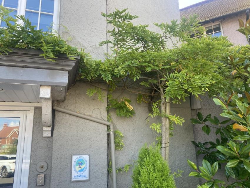 A well-established wisteria, planted in a container within large planted area.